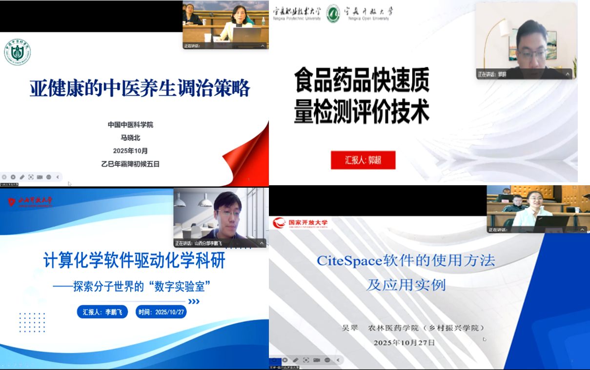 宁夏分部郭超、山西分部李鹏飞、总部吴翠3位办学体系青年教师分别以《食品药品快速质量检测评价技术》《计算化学软件驱动化学科研——探索分子世界的‘数字实验室’》《CiteSpace软件的使用方法及应用实例》为题进行分享交流。